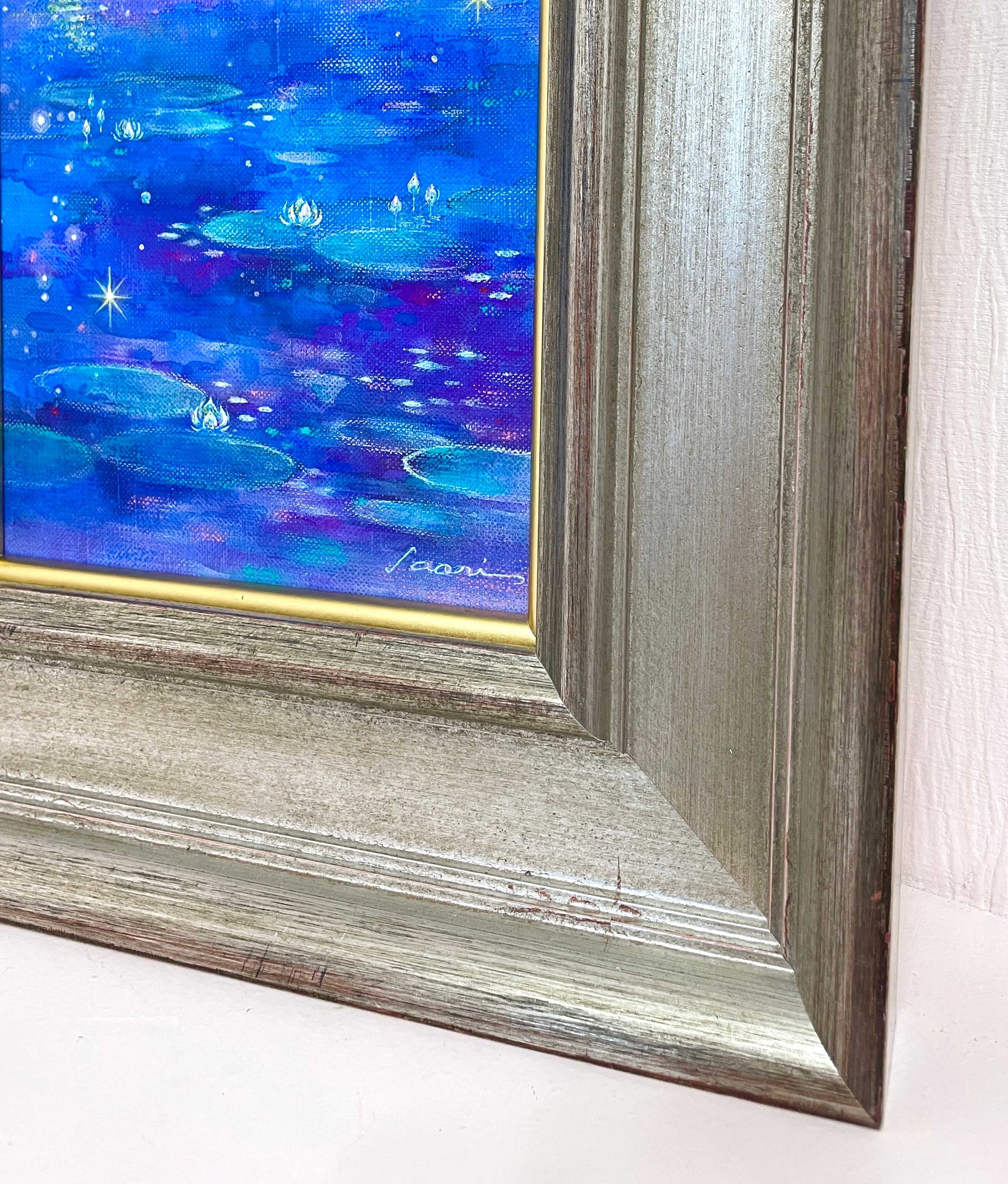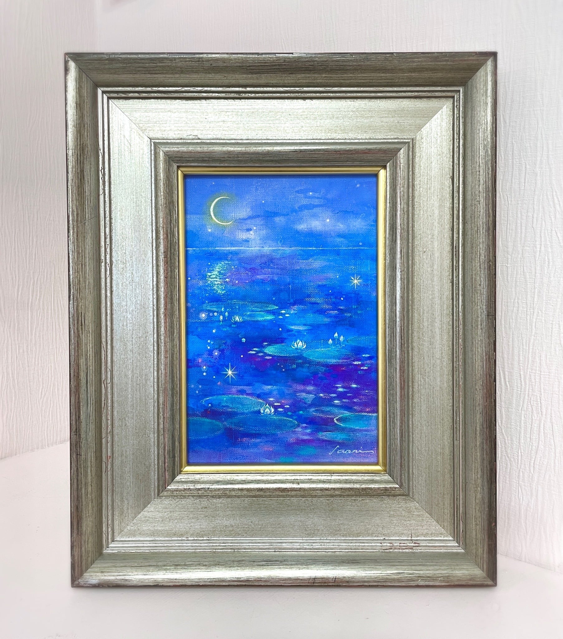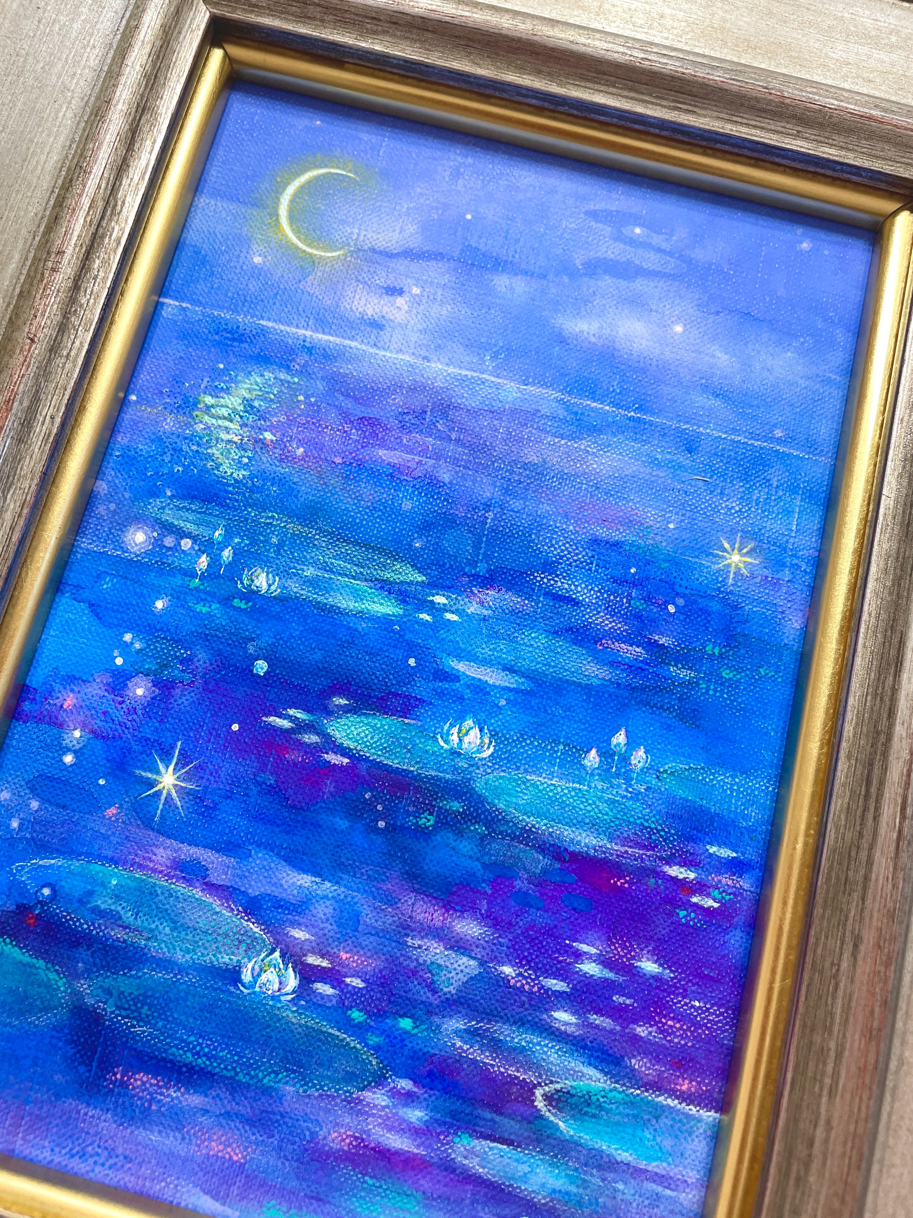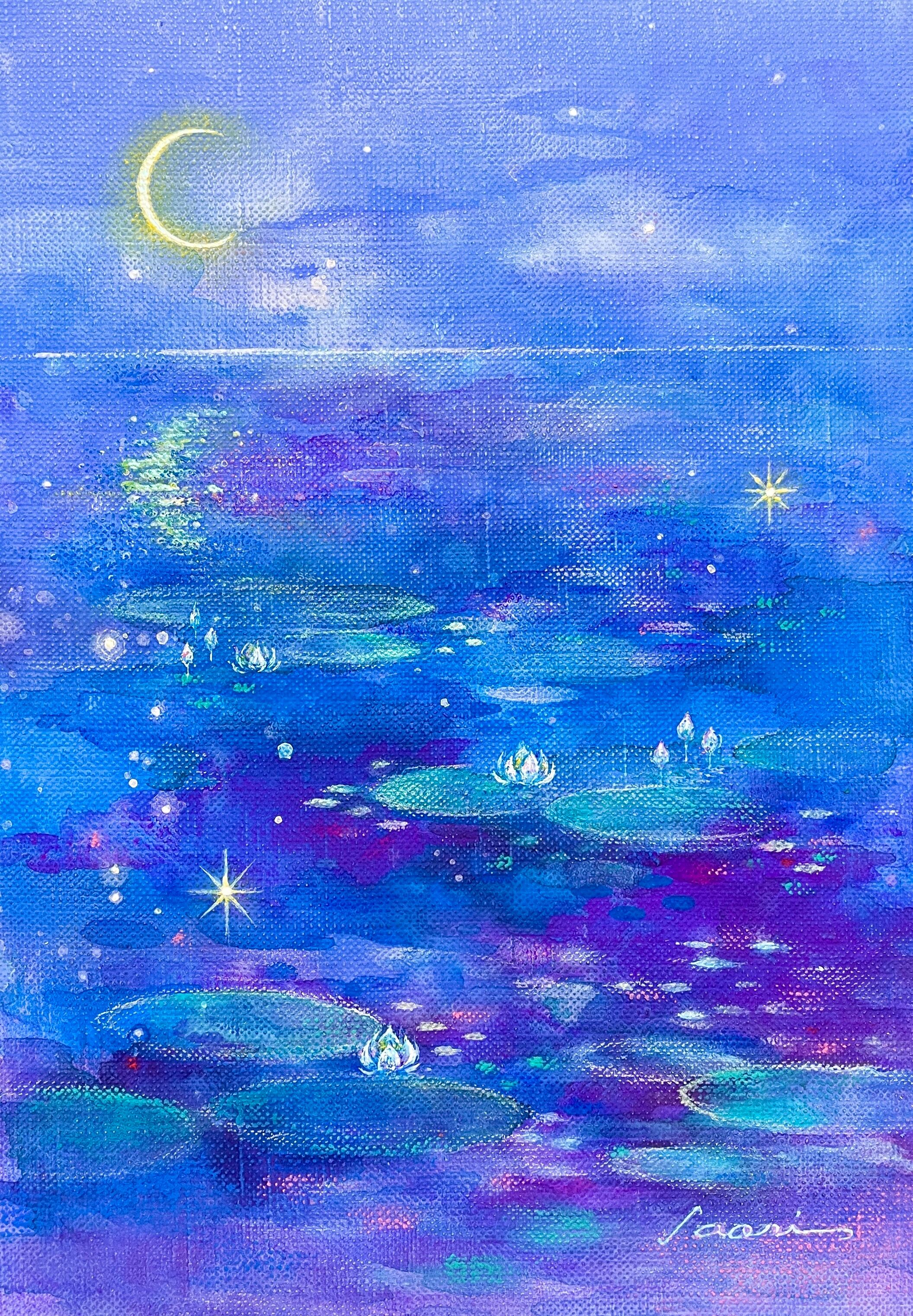 月明かりが水面に溶け、睡蓮が静かに揺れる夜。深く澄んだ青の中に、小さな光が星のように瞬きます。