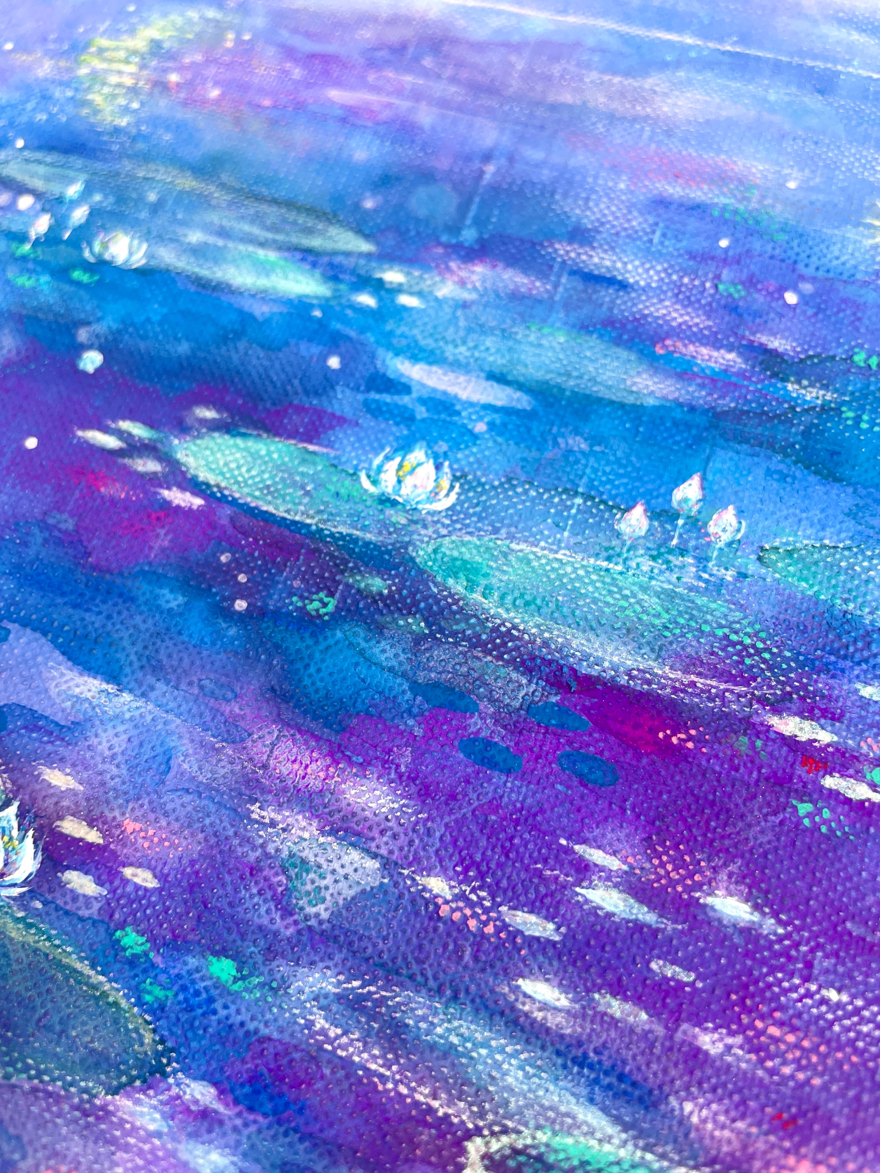 アクリルガッシュを幾重にも重ね、光と影が織りなす水面の奥行きと煌めきを表現しました。