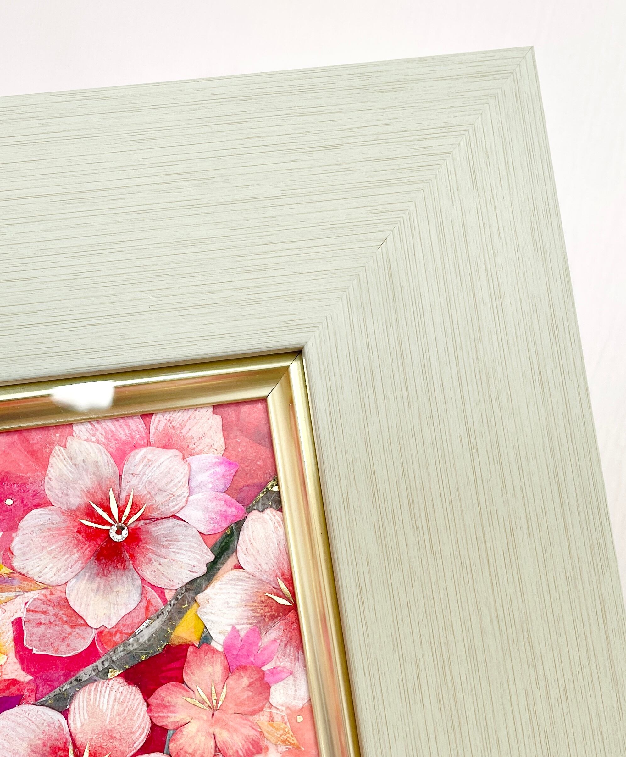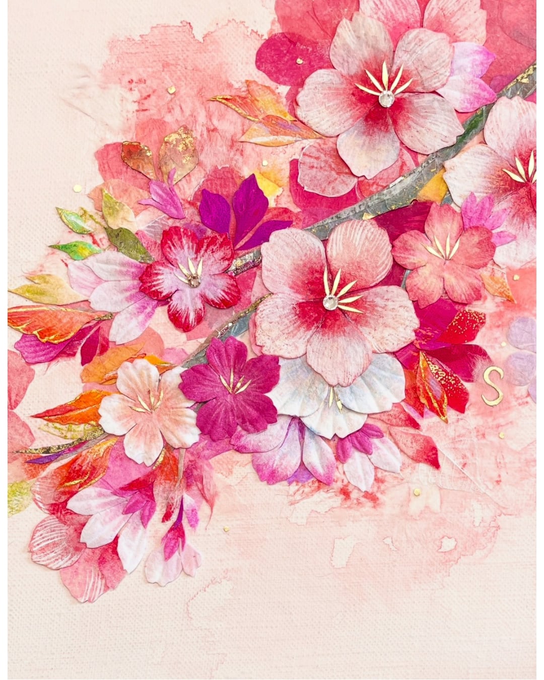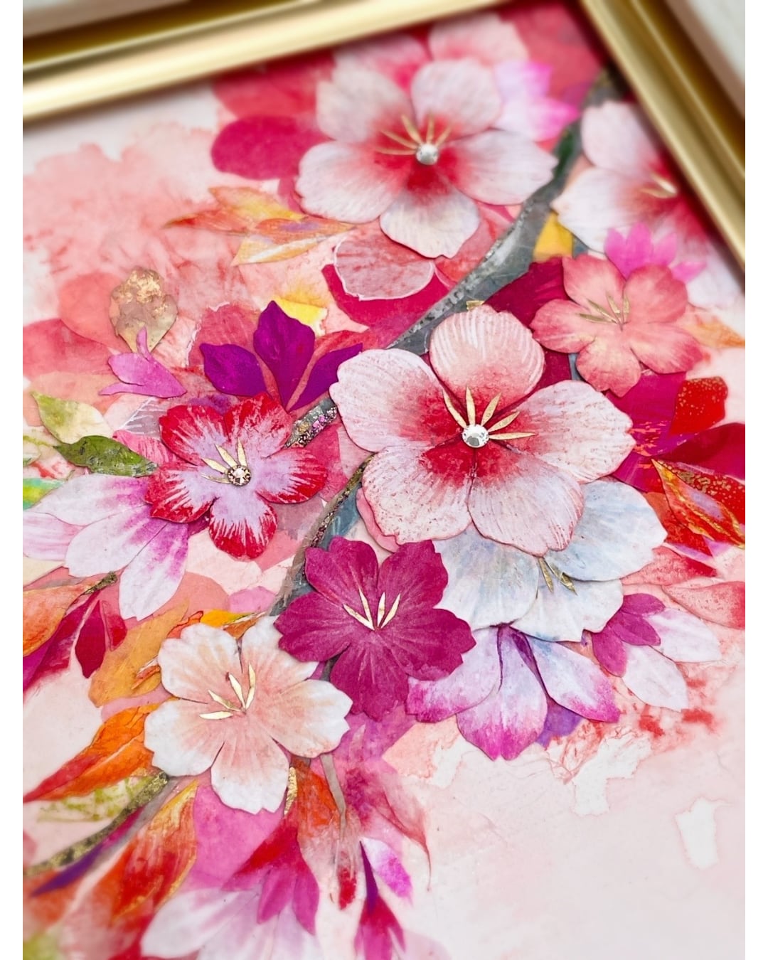 キャンバスに染和紙のコラージュ/アクリルガッシュ/葉脈標本/洋金箔/スワロフスキー