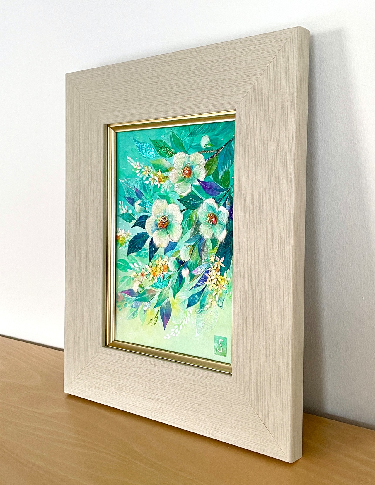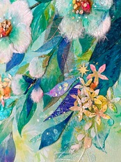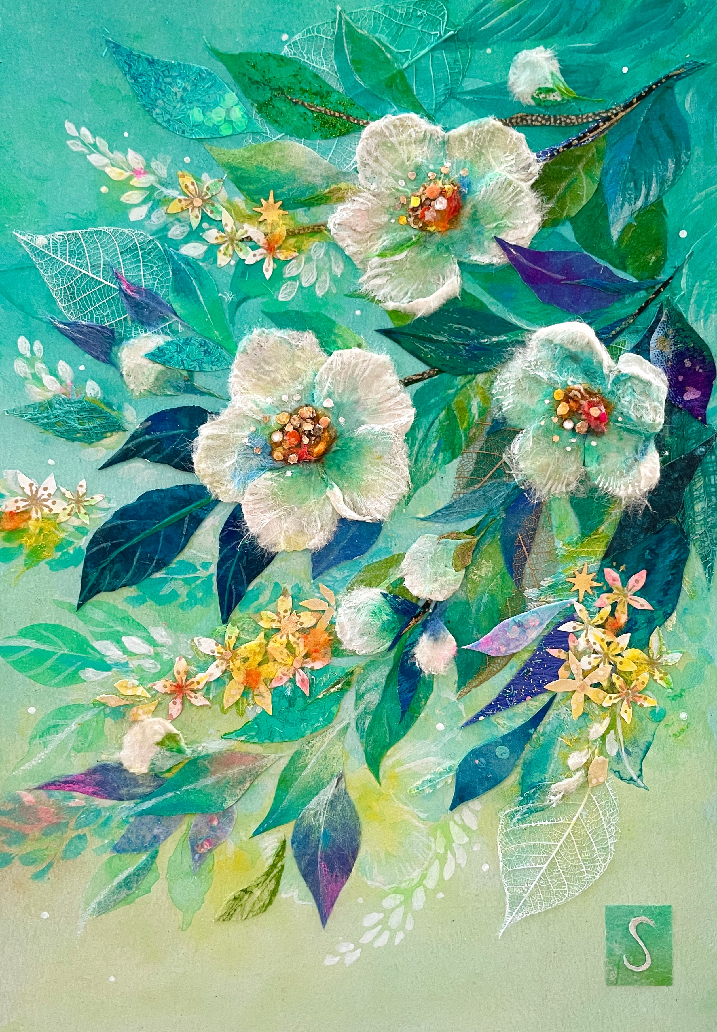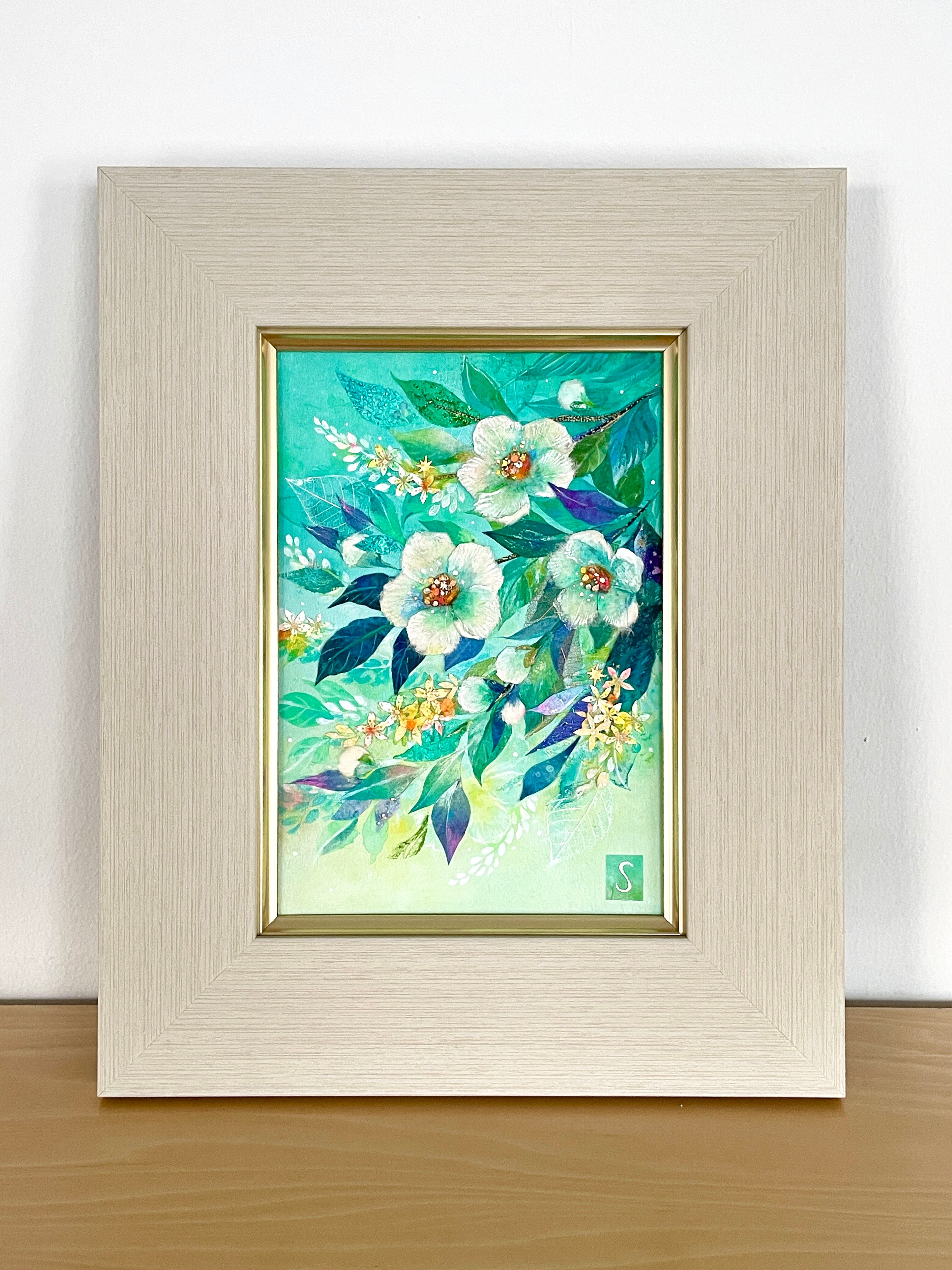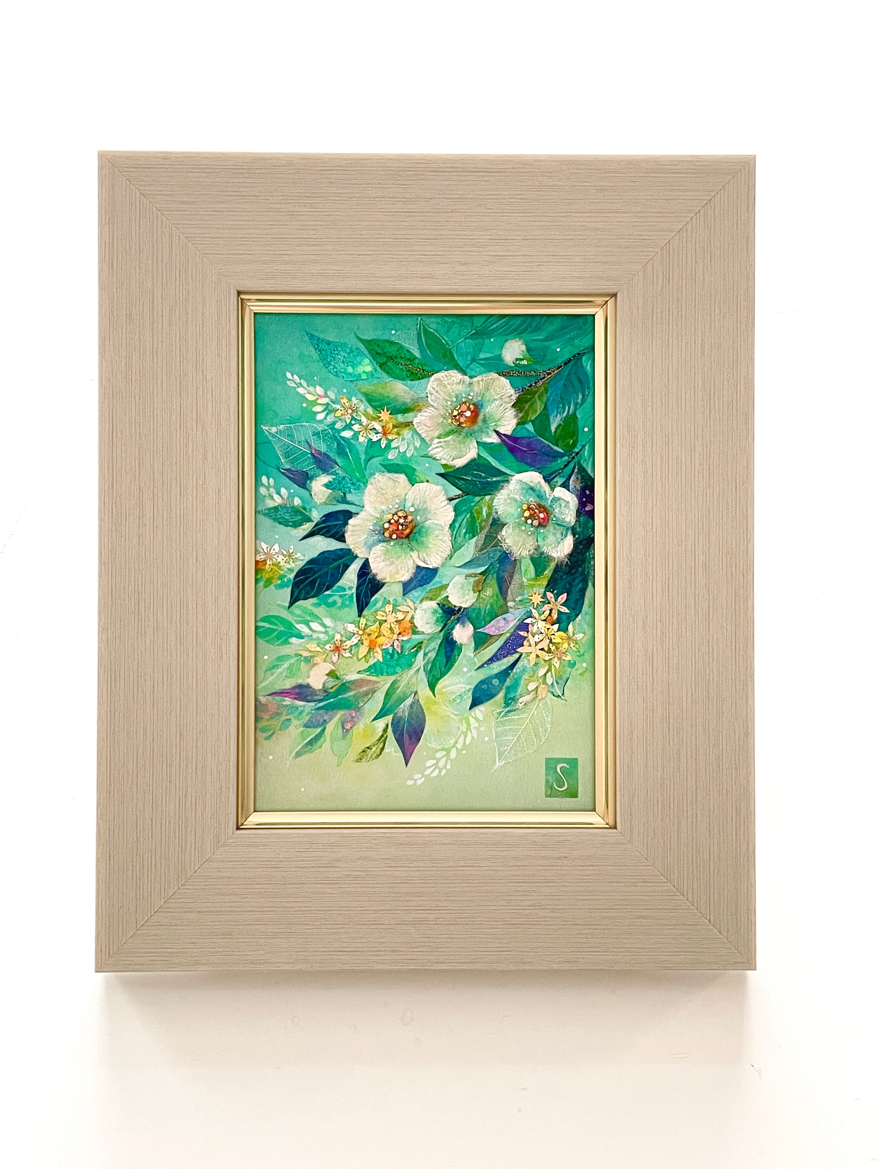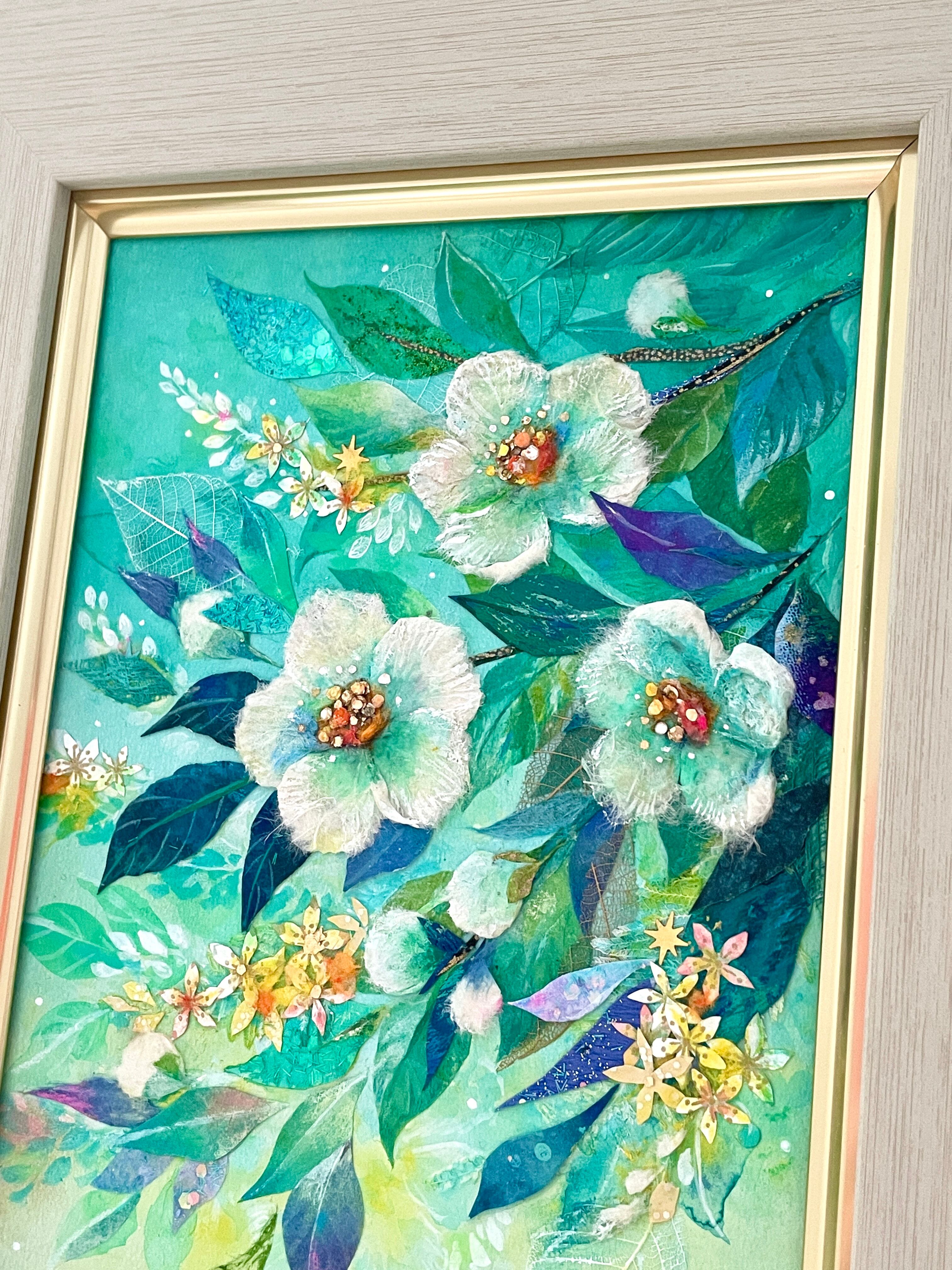 こころに軽やかな風を招くといわれる沙羅双樹(夏椿)を、ちぎり絵の技法を取り入れながら爽やかに描きました。