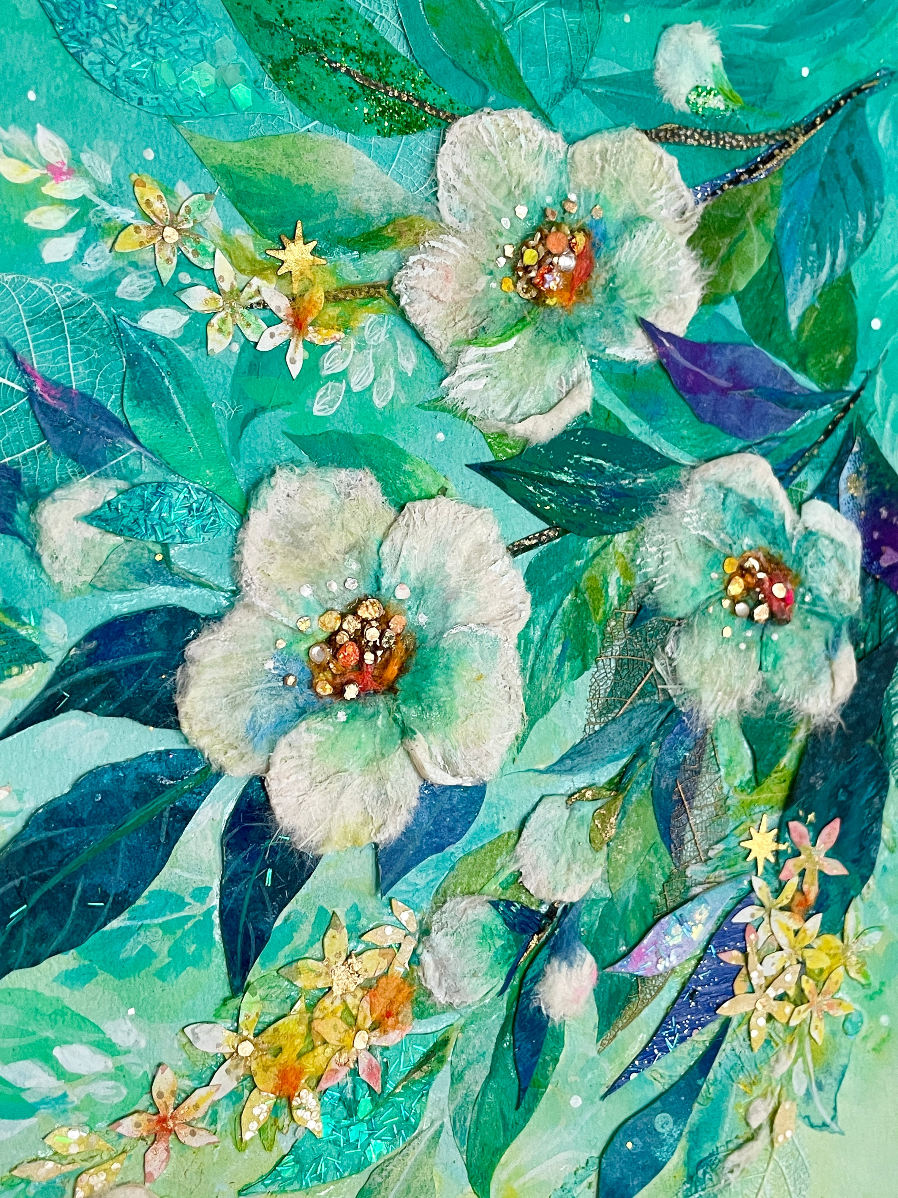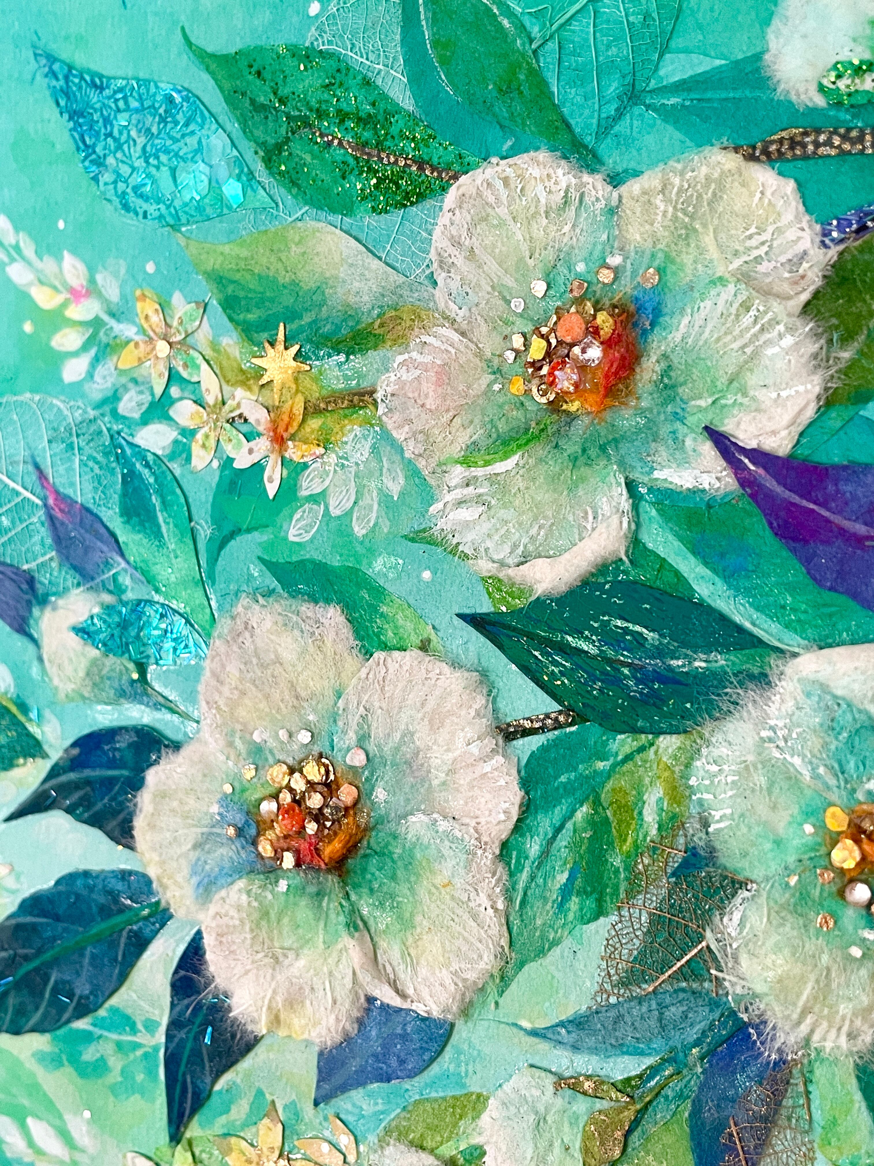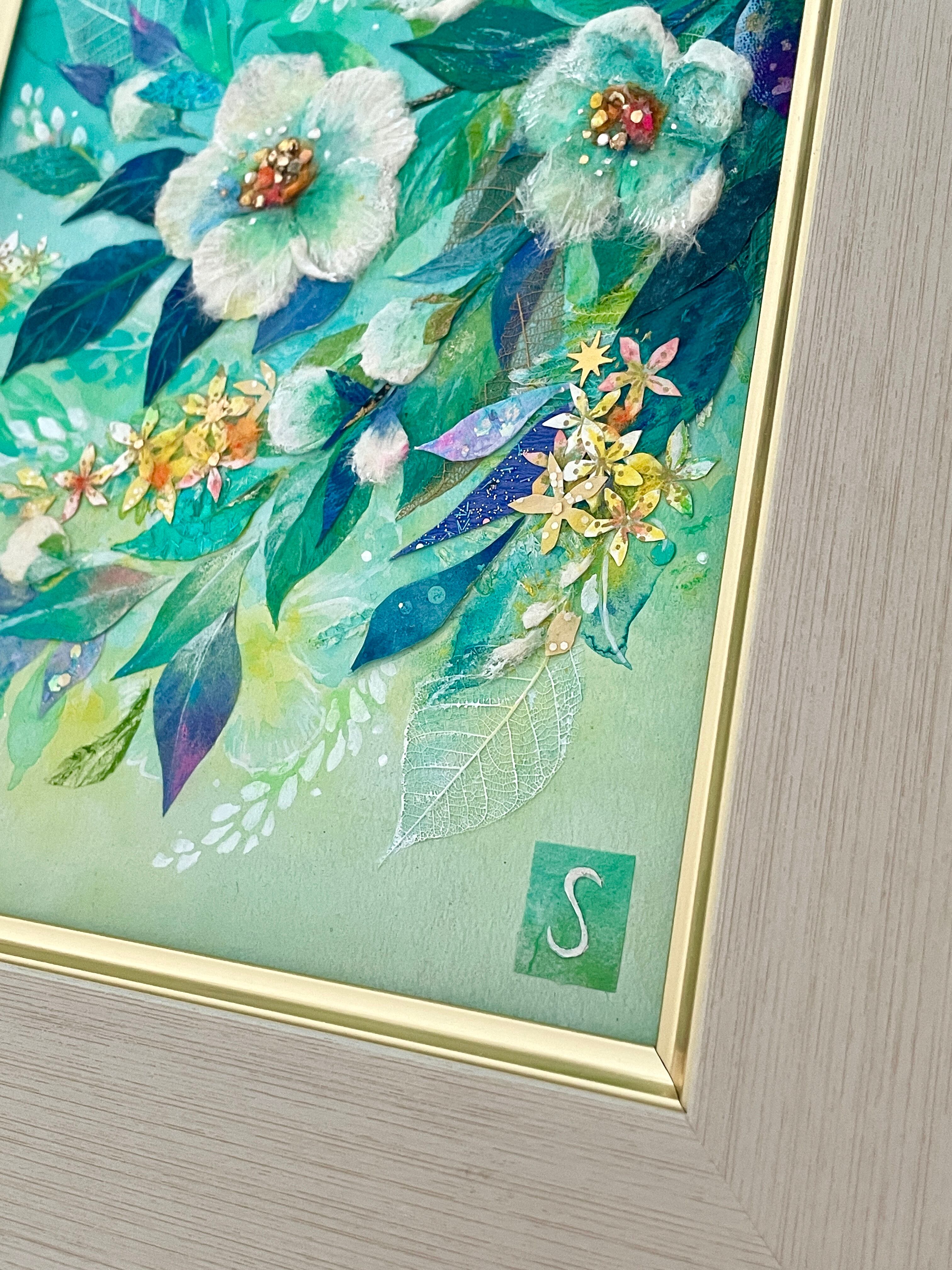 和紙だけでなく、レースのように繊細な葉脈標本や金箔・グリッターなど、多彩な素材をコラージュすることで、清涼感や時の煌めきを表現しています。