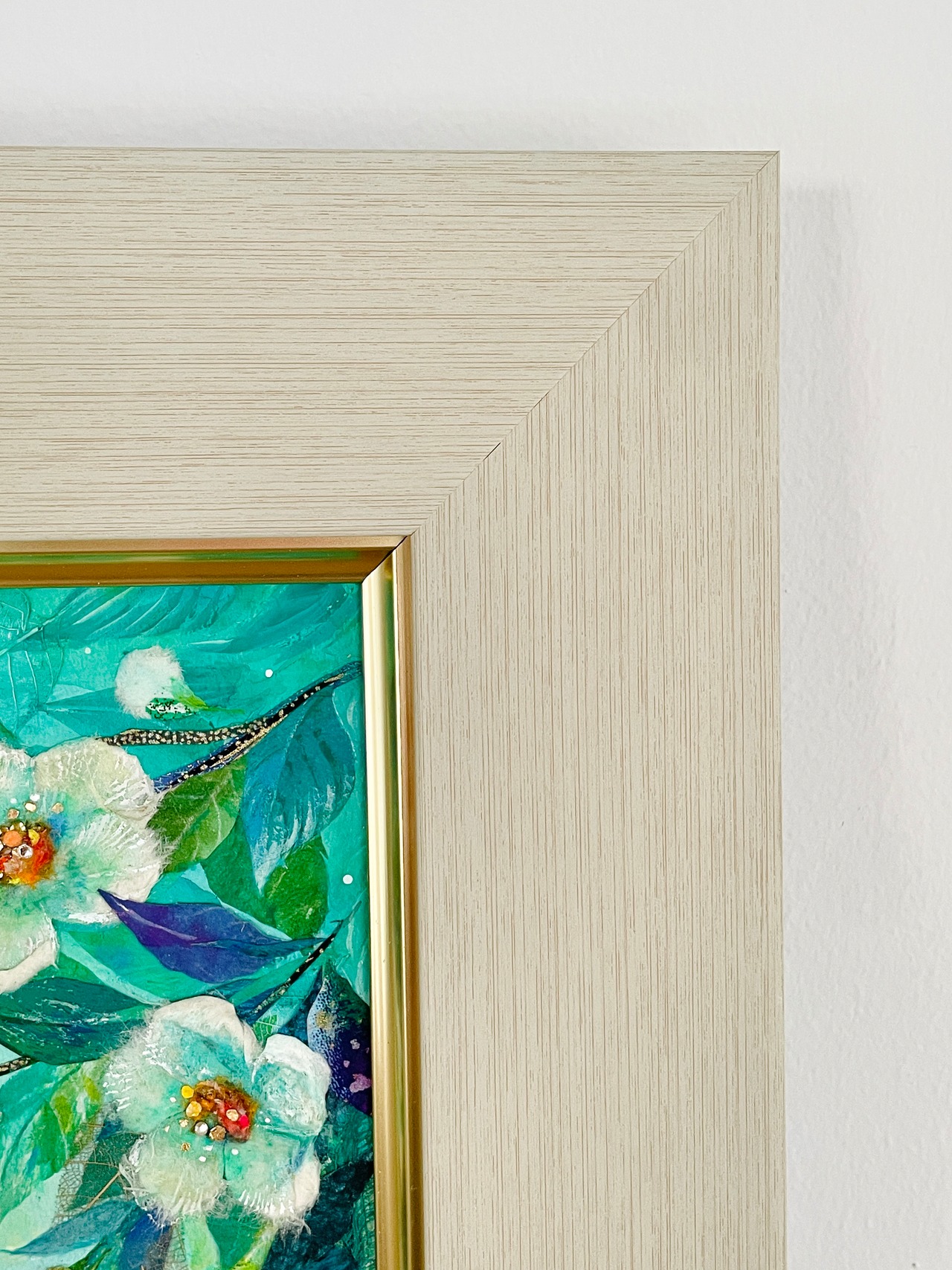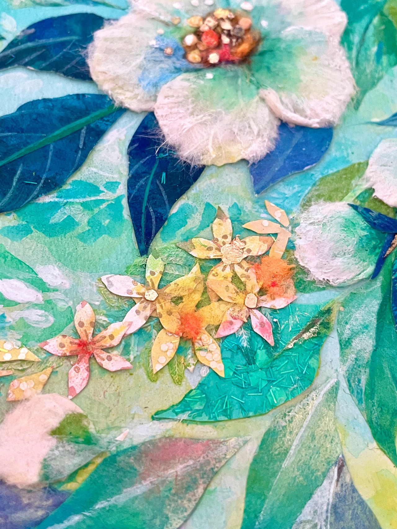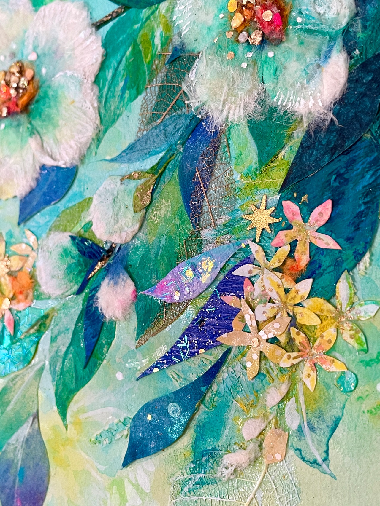 和紙だけでなく、レースのように繊細な葉脈標本や金箔・グリッターなど、多彩な素材をコラージュすることで、清涼感や時の煌めきを表現しています。